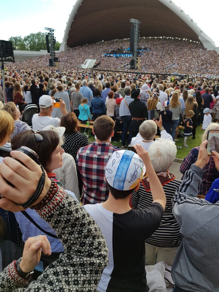 Yleisö, runsaat 100000 ihmistä, osoittavat suosiotaan Viron lippuja heiluttamalla ja erilaisin sanallisin tervehdyksen.