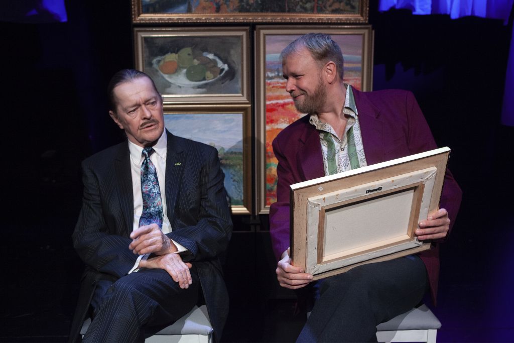 Ola Tuominen esittää väärentäjä Veli Seppää. Hän on roolissa haka. Jani Karvisen esittämä Jouni Ranta pääsi taulukauppojen makuun Sepän tuotteliaisuuden ja taituruuden ansiosta. (Kuva: Tampereen Komediateatteri)