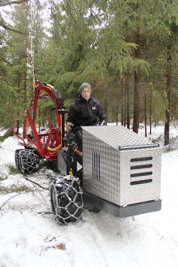 Tilan rakennusten pääasiallinen lämmönlähde on polttopuu, ja Markus Heinonen on rähjännyt aiemmin kotitalon rankametsällä mönkijän kanssa ja käsipelillä heitellyt pöllejä itsetehdyn metsäkärryn kyytiin. Ei siis ihme, että kotitarvepolttopuun tekijällä idea pienoiskokoisen metsätyökoneen tekemisestä alkoi pyöriä mielessä.