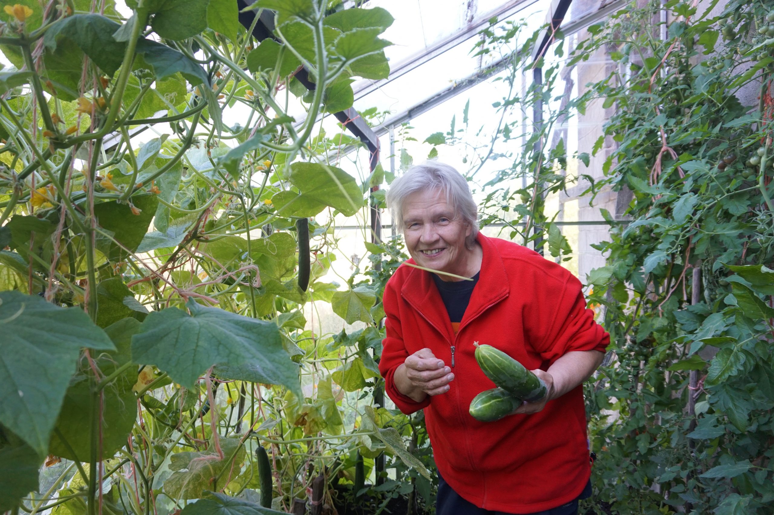 Kasvihuone on ollut runsaan neljänkymmenen vuoden ajan navetan päätyseinustalla. Näin ollen kotikasvatetut tomaatit ja kurkut ovat kuuluneet pöydän antimiin vuosikymmenien ajan. Tänä kesänä erikoisuutena on tummanpuhuvat kirsikkatomaatit.