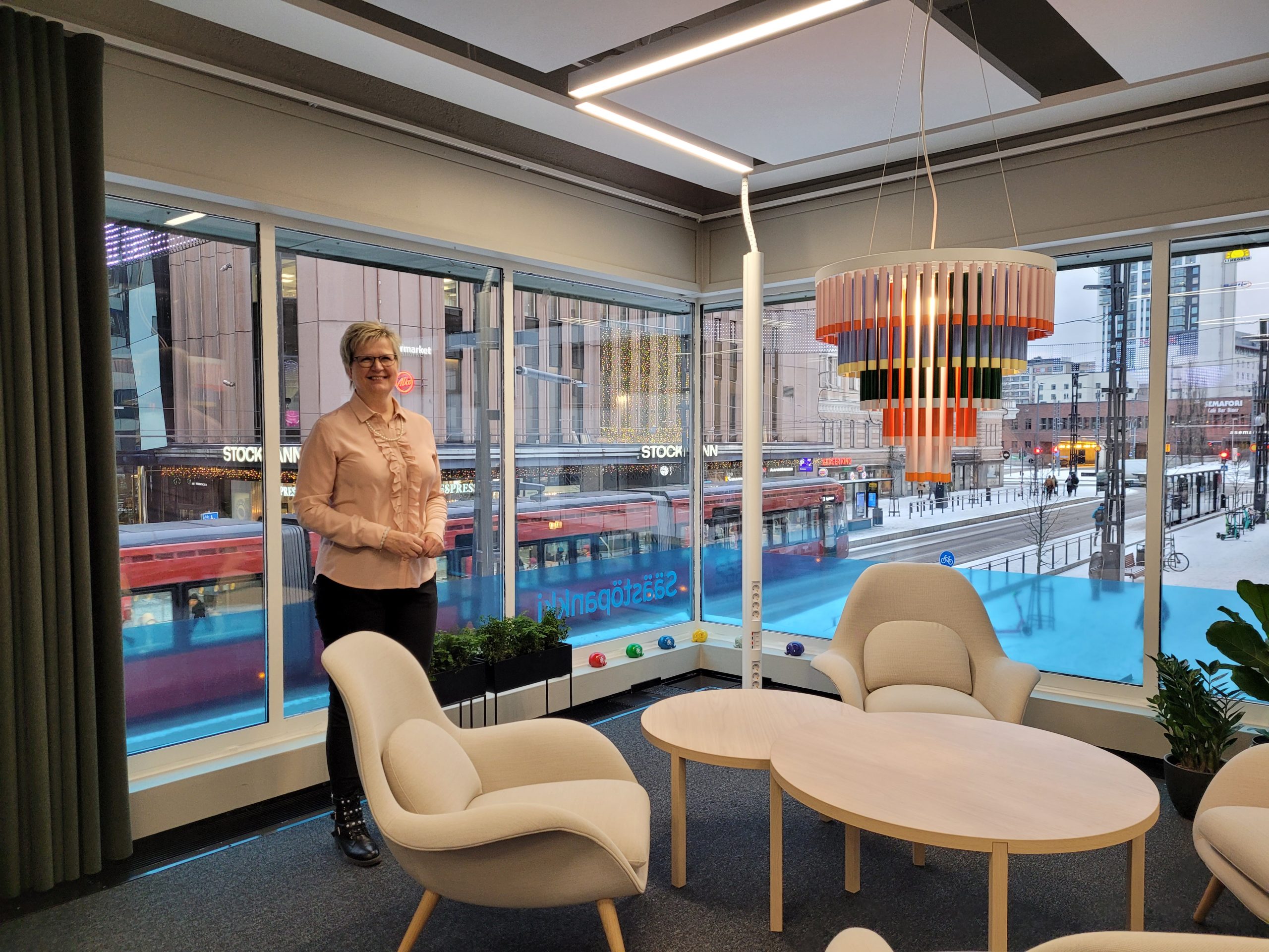 Toimitusjohtaja Pirkko Ahonen esitteli maanantaina Aito Säästöpankin modernin talouden valmentamon. Se sijaitsee Tampereen sykkeessä Hämeenkadun varrella.
