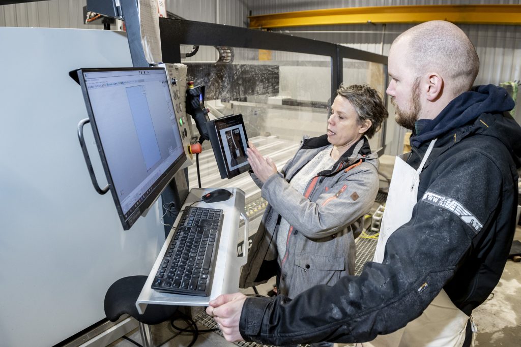 Perinteikäs pirkanmaalainen Kiviliike Sairanen Oy on toiminut runsaan 60 vuoden ajan. Yritys valmistaa kaikki hautakivet kotimaisista kivilajeista Hämeenkyrössä. Ala on edelleen käsityövoittoista, vaikka yrityksellä on alan moderneinta teknologiaa ja työstötekniikkaa. Kaisa Ollila ja Artturi Sivander ratkovat hautakiven uniikin muodon toteutusta tuliterän kiven työstökoneen äärellä. (Kuva: Rami Marjamäki)