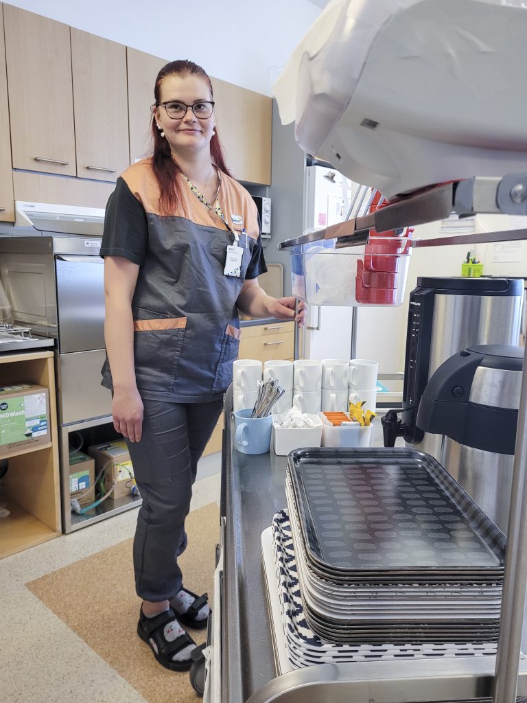 – Riippuen vuorosta tarjoan aamupalan, kerään astiat, jaan lounaan, huolehdin astiat, samoin päiväkahveilla, päivällisellä ja iltapalalla. Ruokapalvelu on merkittävä osa työsarasta. Huolehdimme vuorollamme myös potilashuoneiden ja yleisten tilojen siisteydestä. Hoidamme pyykit. Petaamme sängyt. Vastaamme välineiden puhtaudesta. Paljon eri tehtäviä ja kaikki mielenkiintoista.