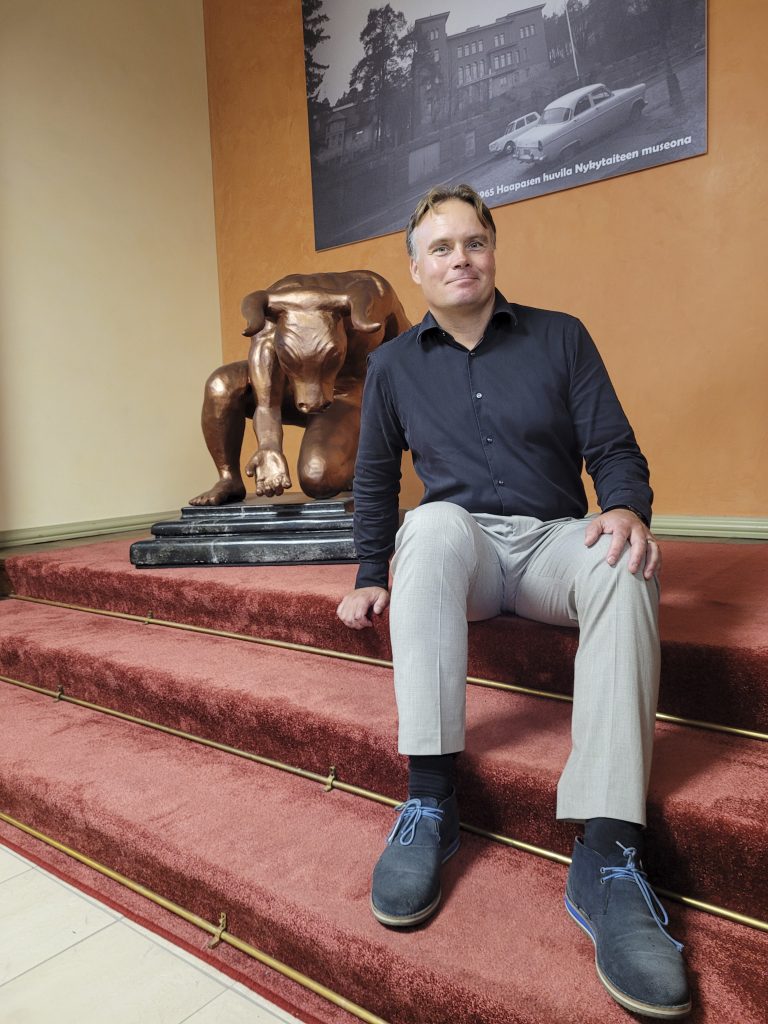 Kuntayhtymäjohtaja Antti Lahti sanoo, että Saskyllä on valtakunnallisesti merkittävä rooli erikoisammattilaisten koulutuksessa. Taustalla oleva veistos on valmistettu SASKY Koulutuskuntayhtymään kuuluvassa Tyrvään käsi- ja taideteollisuusoppilaitoksessa.