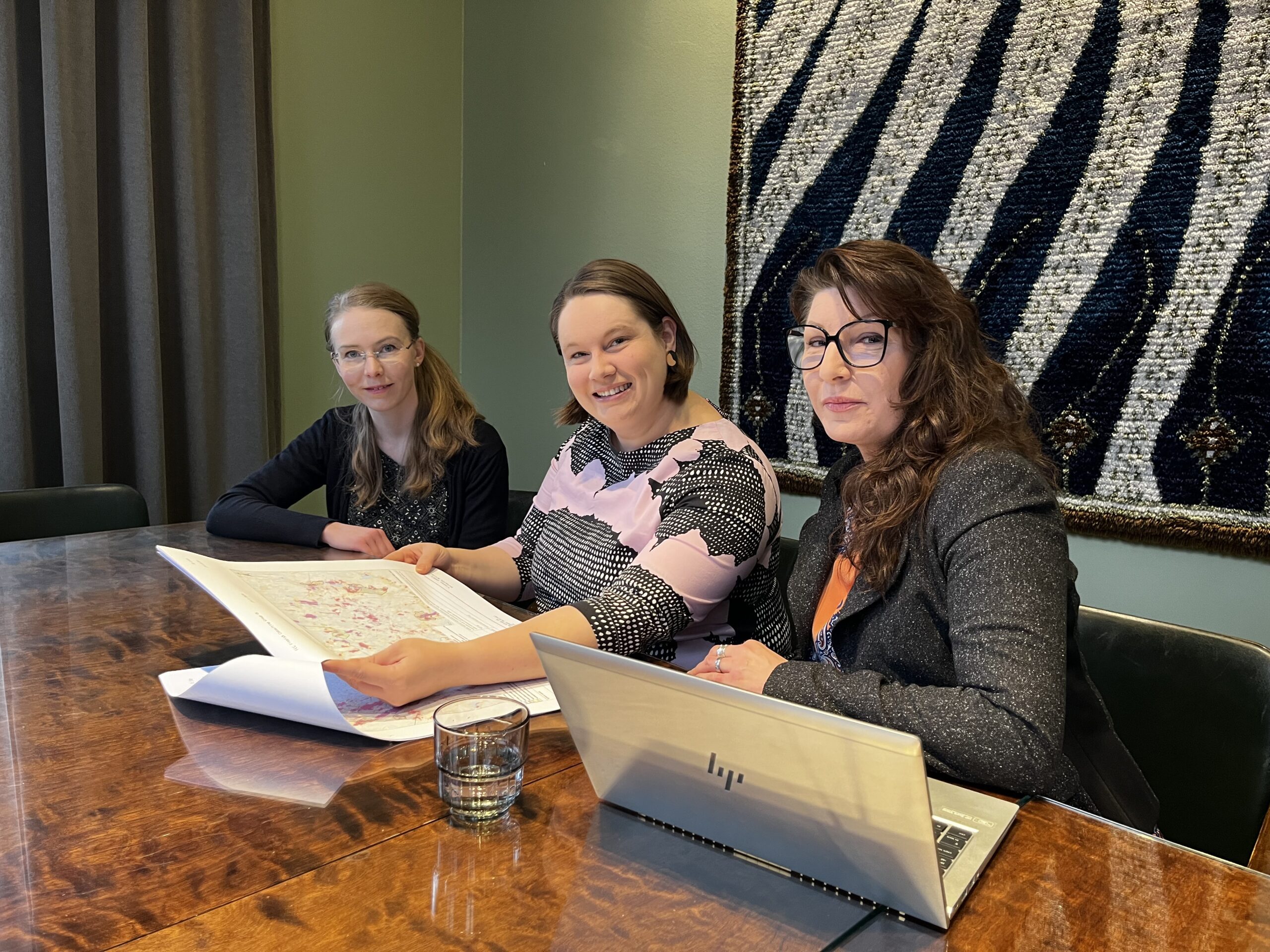 Pirkanmaan liitossa suunnittelija Johanna Kuusterä (vas.), suunnittelujohtaja Ruut-Maaria Rissanen ja suunnitteluinsinööri Iris Lehkonen ovat tyytyväisiä vuoropuheluun, jota on jo kahden valmisteluvuoden ajan käyty rakentavassa hengessä vaihemaakuntakaavasta. Sen luonnos on parhaillaan nähtävillä, ja pirkanmaalaisilta odotetaan edelleen aktiivista kommentointia. Kuva: Pirkanmaan liitto