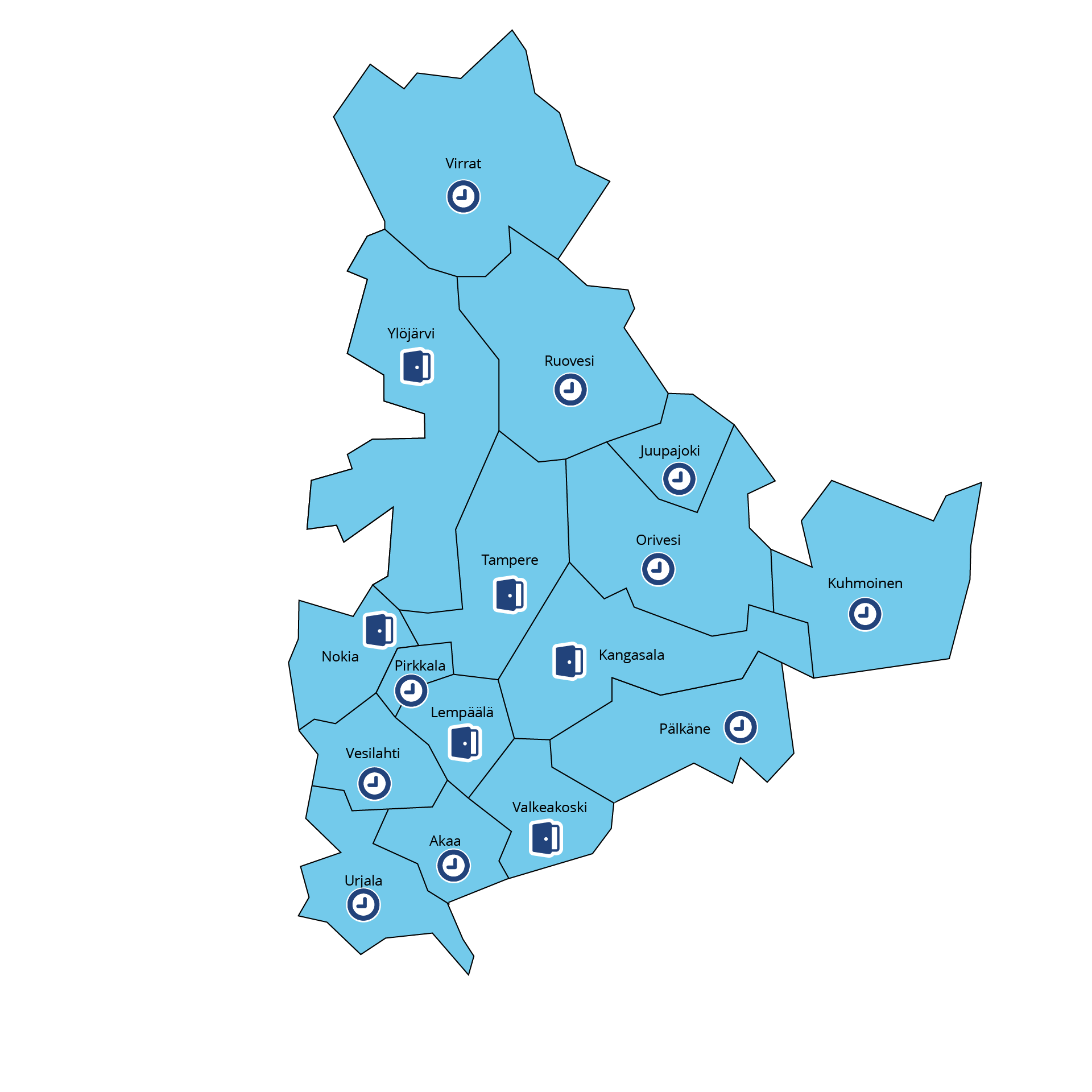 16 pirkanmaalaista kuntaa on mukana Tampereen seudun työllisyysalueessa, joka aloittaa toimintansa 1. tammikuuta 2025. Osa toimipisteistä toimii ajanvarauksella, suuremmissa palvelupaikoissa voi asioida myös ilman ajanvarausta.