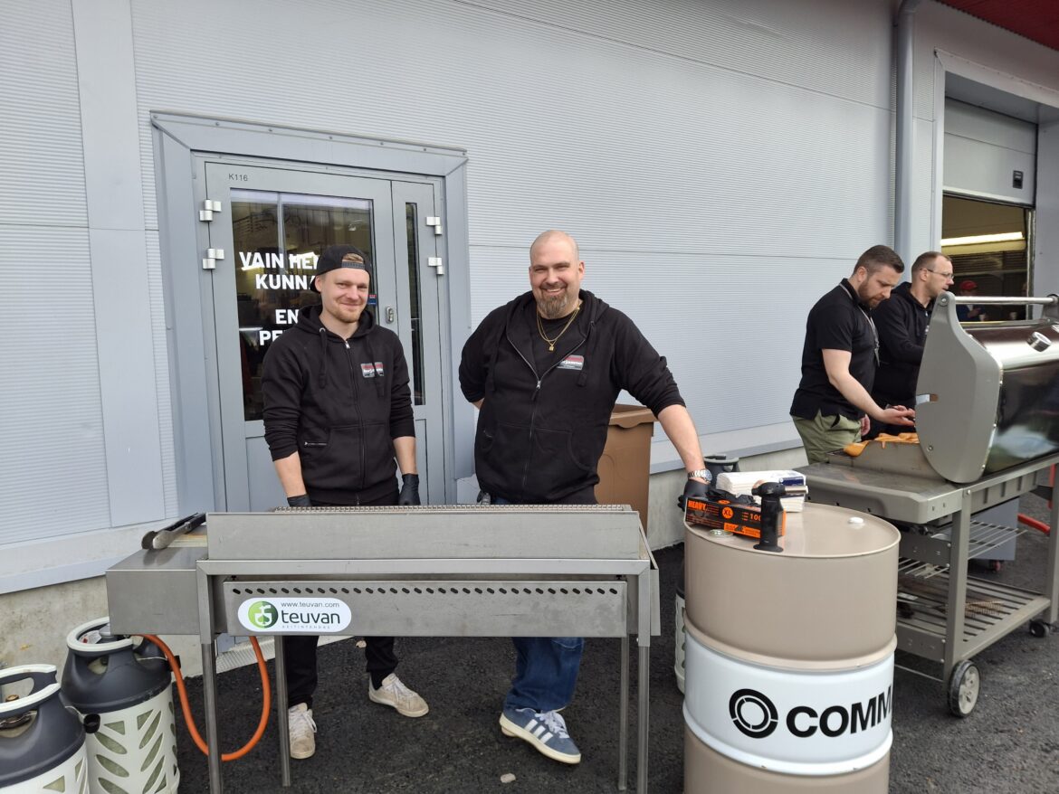 Makkaranpaisto aloitettiin yleisön pyynnöstä jo tuntia aiemmin noin klo 09:00 ja siittä lähtien sitä on mennyt noin 500 makkaraa tunnissa.” Kertoo Arto Suontausta. Tarjolla on myös kahvia, mehua ja pullaa, mutta näidenkin osalta kannattaa olla ajoissa paikalla. Arto kuvassa oikealla.